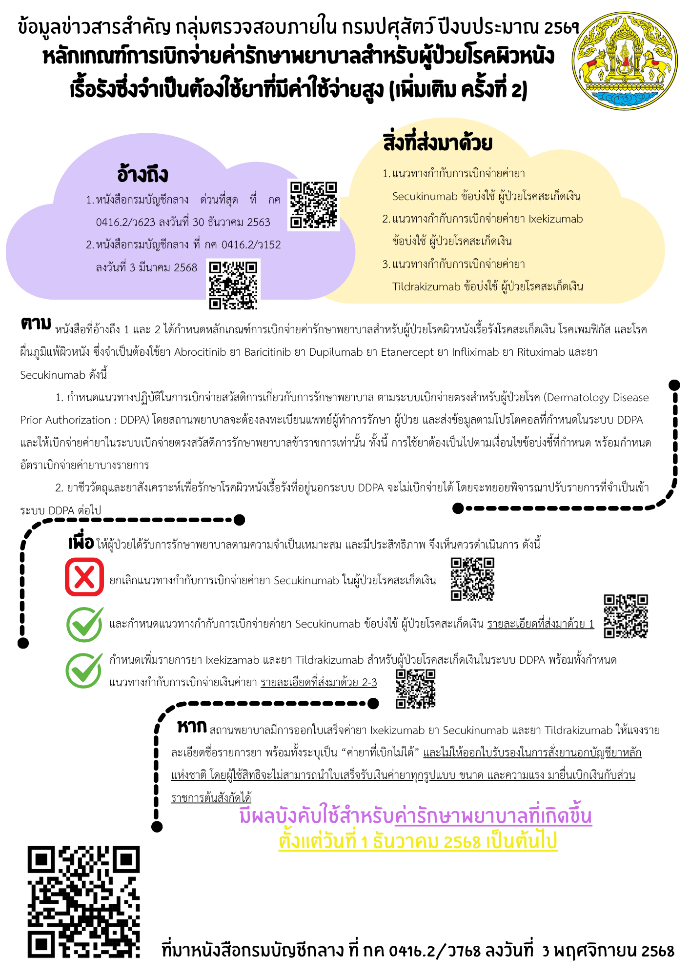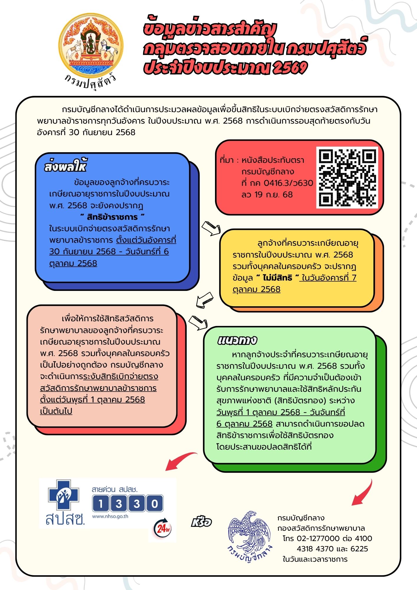 | 1. กรมบัญชีกลางได้แจ้งดำเนินการประมวลผลข้อมูลเพื่อขึ้นสิทธิในระบบเบิกจ่ายตรงสวัสดิการรักษาพยาบาลราชการทุกวันอังคาร ตามหนังสือกรมบัญชีกลางที่กค 0416.3/ว630ลงวันที่ 19 กันยายน 2568 |