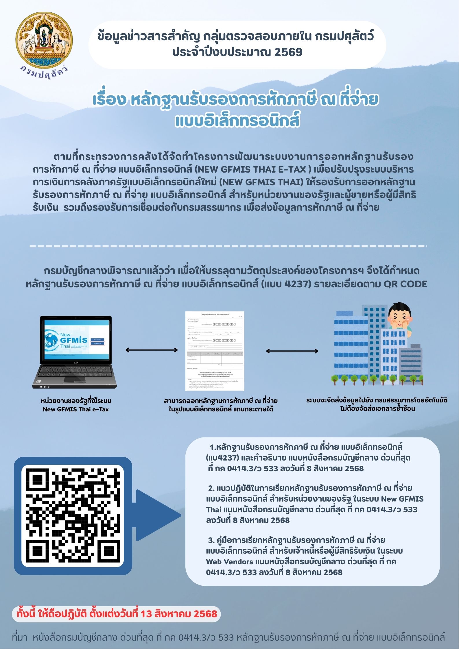 | 4. แนวปฏิบัติในการวิจัยรายการหักภาษี ณ ที่จ่าย กรณีมีเงินประกันผลงานหรือเอกสารลดหนี้บัตรเครดิตการเงินการคลังแบบอิเล็กทรอนิกส์ (New GFMIS Thai) ตามกรมหนังสือกลางที่ กค 0417.3/ว558 ลงวันที่ 1 กรกฎาคม 2568 |